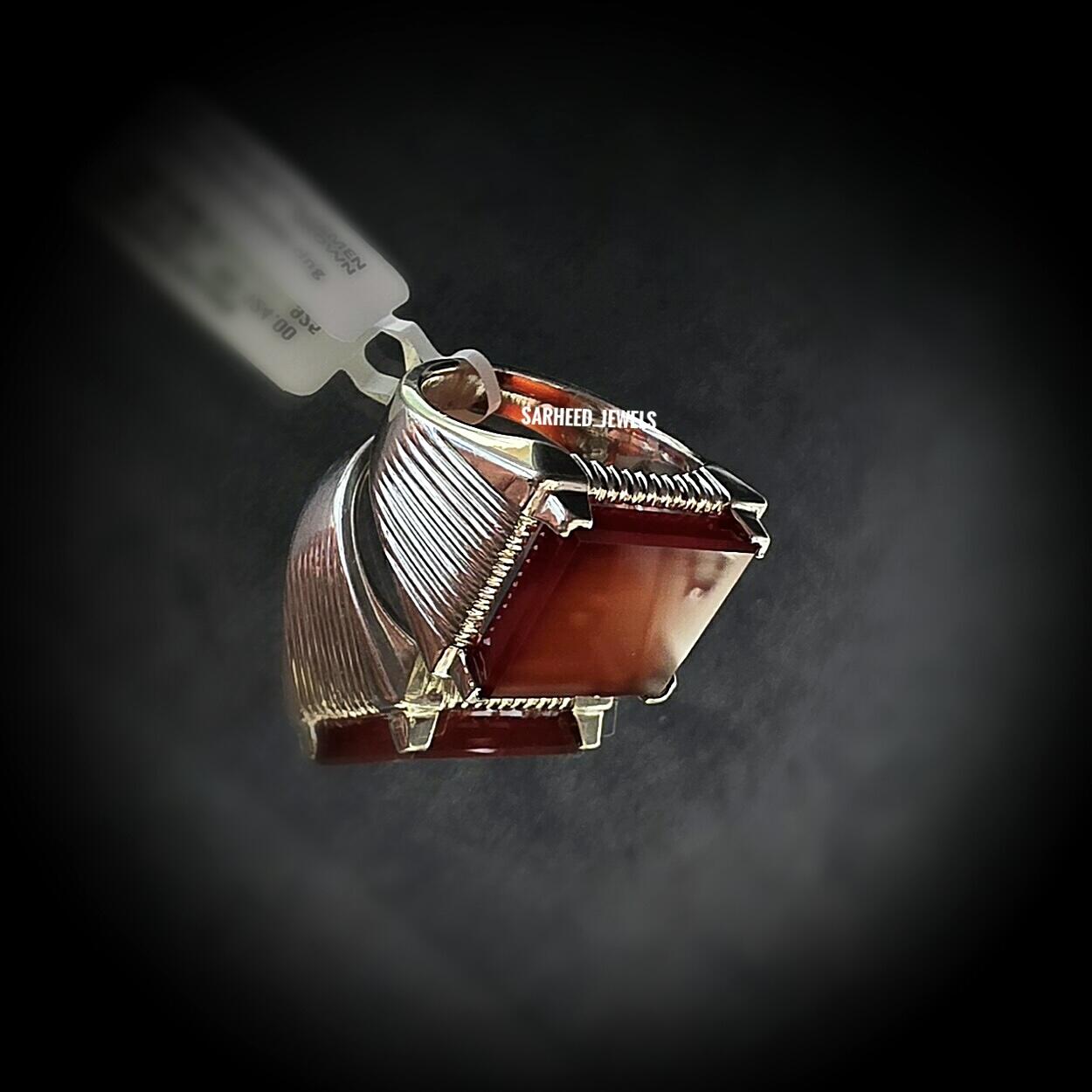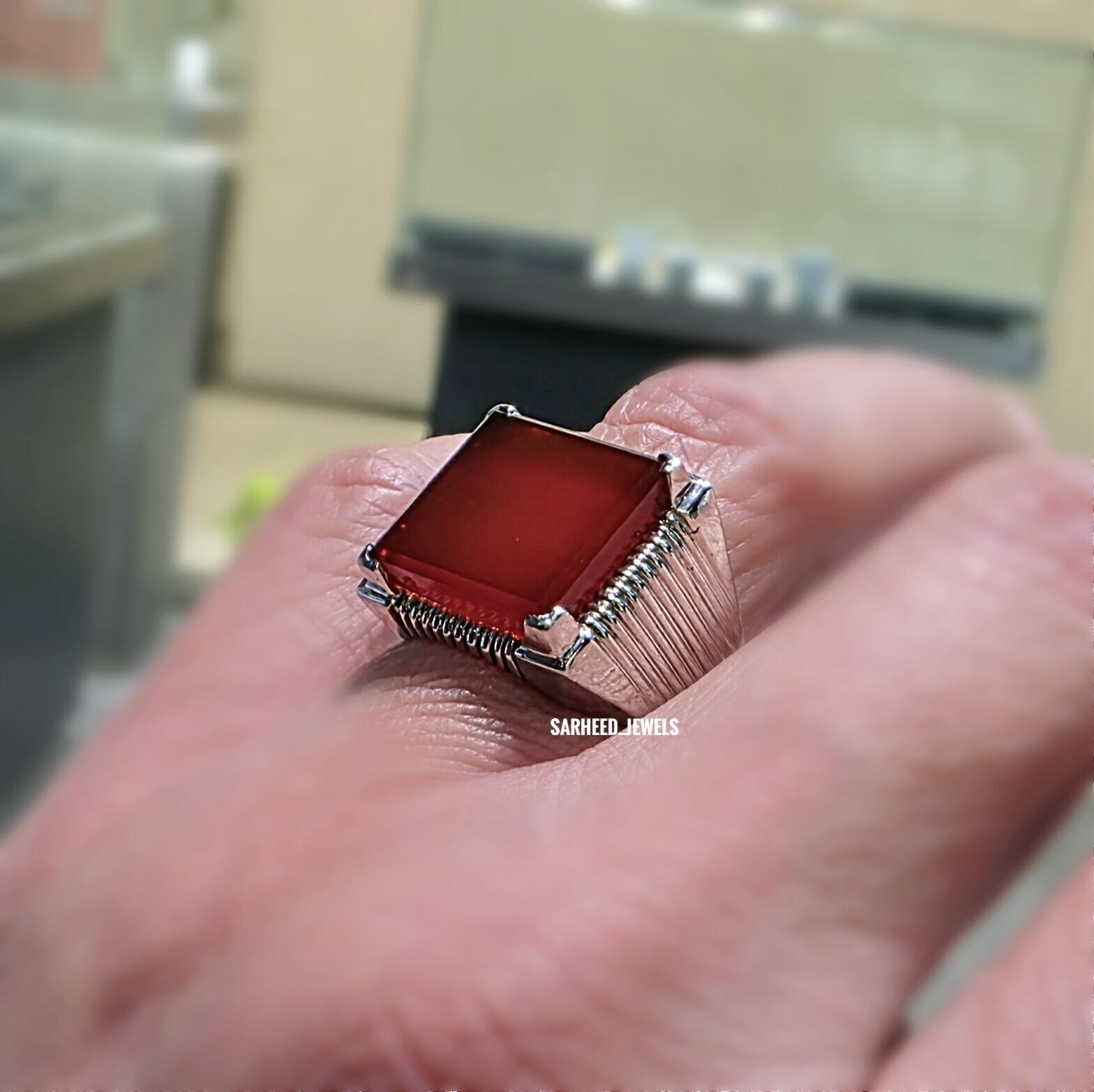 خاتم فضة مشغول يدويًا بحرفية عالية، مزين بعقيق يماني طبيعي مقطوع بعناية خاصة، يجمع بين سحر الطبيعة وأصالة التراث في قطعة أنيقة لا يزول جمالها مع الزمن.