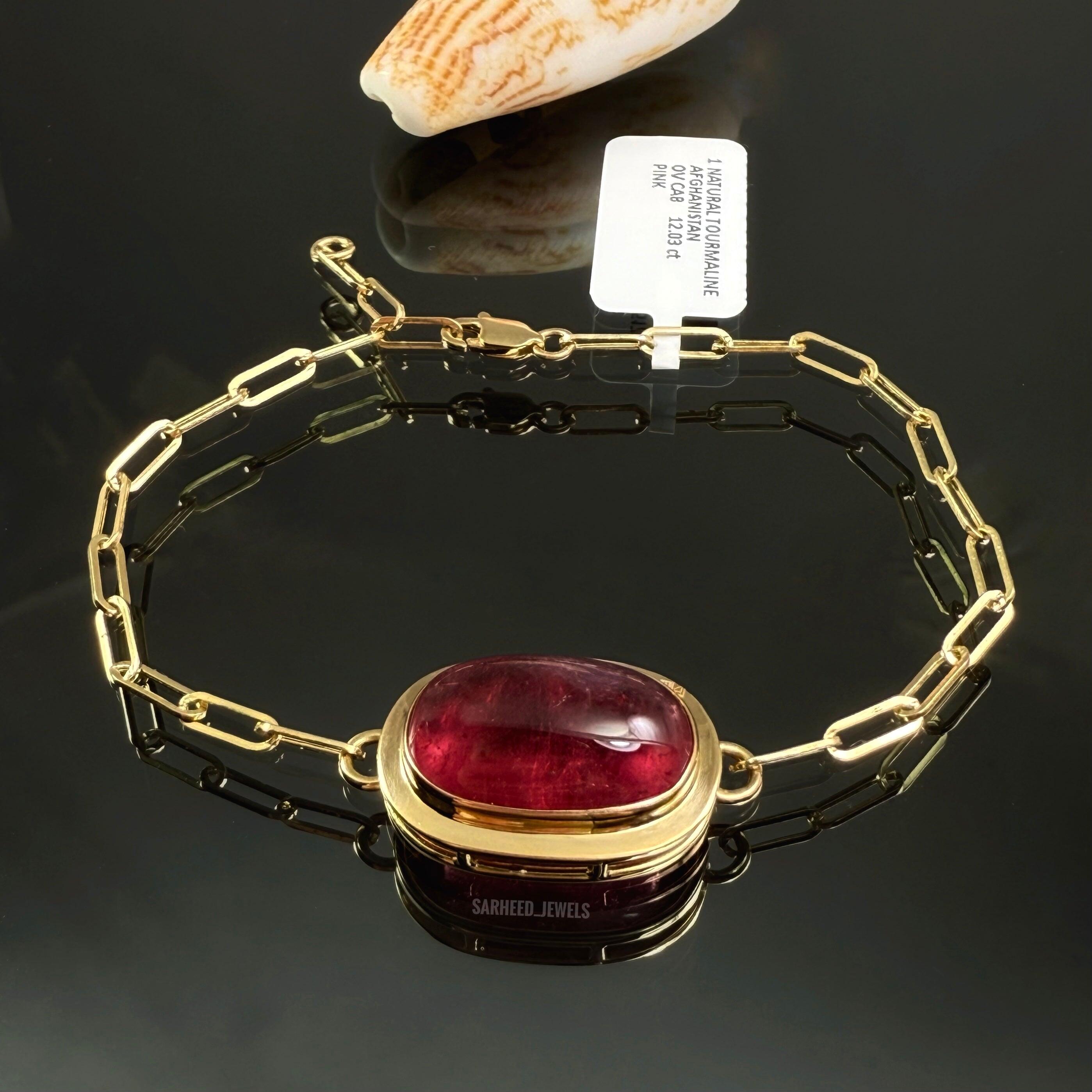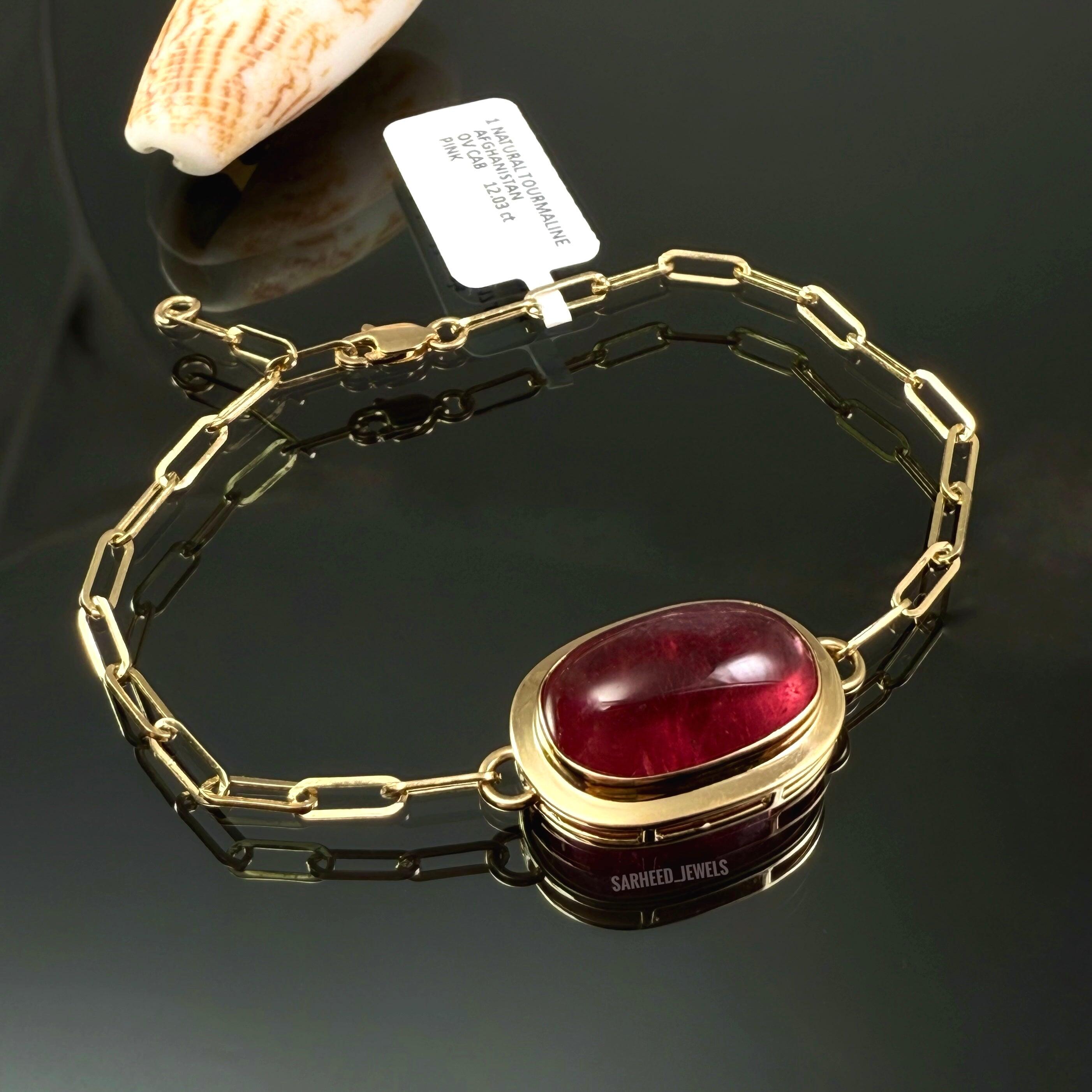 HomeNatural Pink Tourmaline Yellow Gold 18K BraceletNatural Pink Tourmaline Yellow Gold 18K BraceletDescriptionDelicate 18K yellow gold bracelet featuring a radiant pink tourmaline, elegantly set to showcase its vibrant color and natural sparkle.I agree toTerms & Conditions